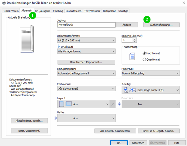 Klicken Sie im Reiter Allgemein (1) auf den Button Authentifizierung... (2). Nun öffnet sich das Authentifizierungsfenster.