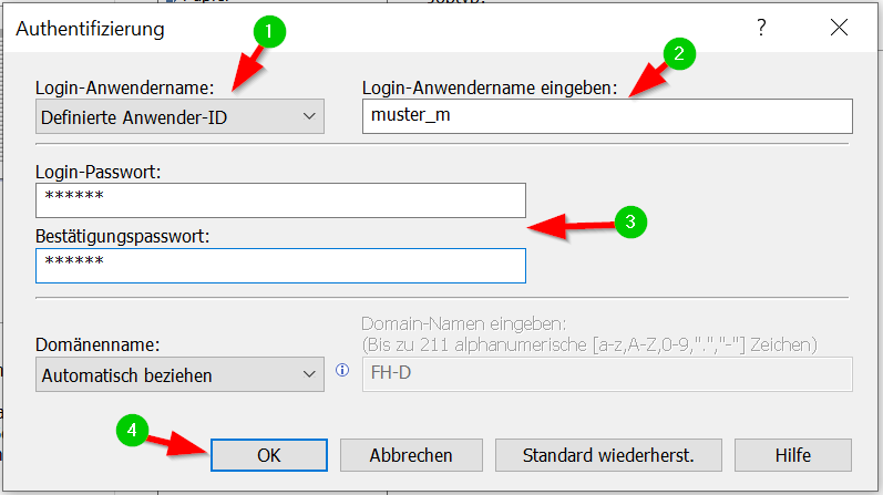 Setzen Sie den Haken bei Anwender-Authentifizierung und wählen Sie bei Login-Anwendername die Definierte Anwender-ID aus. Geben Sie bei Login-Anwendernamen eingeben Ihren HSD Account wie im Beispiel muster_m. ​
